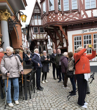 Am Sonntag ging es dann nach Abreise aus dem Hotel in das wunderschöne Bernkastel-Kues, wo bei einer Stadtführung in zwei Gruppen die Geschichte des Doppelortes an der Mosel deutlich wurde. Und auch der Kampf mit den viel zu häufig eintretenden Hochwassern, von denen der Ort fast regelmäßig heimgesucht wird. Am höchsten war es 1784, wie es Marken an einem Haus am Marktplatz zeigen, aber auch 2021 stand das Wasser wieder meterhoch in den Straßen und Häusern. Beeindruckend das kleine Fachwerkhaus am Markt, aufgebaut wie das Bügeleisen-Haus in Hattingen., d.h., oben breit und unten ganz schmal.